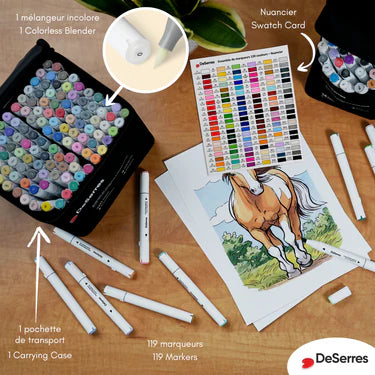 Unlock unlimited creative potential with this expansive 120-piece alcohol marker collection from DeSerres.