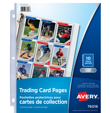 Whether you've been collecting all your life or just getting started, Avery® Trading Card Pages will give your card collection the protection it deserves. Each page holds up to 9 cards in translucent pockets that will make it easier to enjoy both the front and back of your cards. Each sheet is prepunched for storage in a three-ring binder for easy reference and organization.