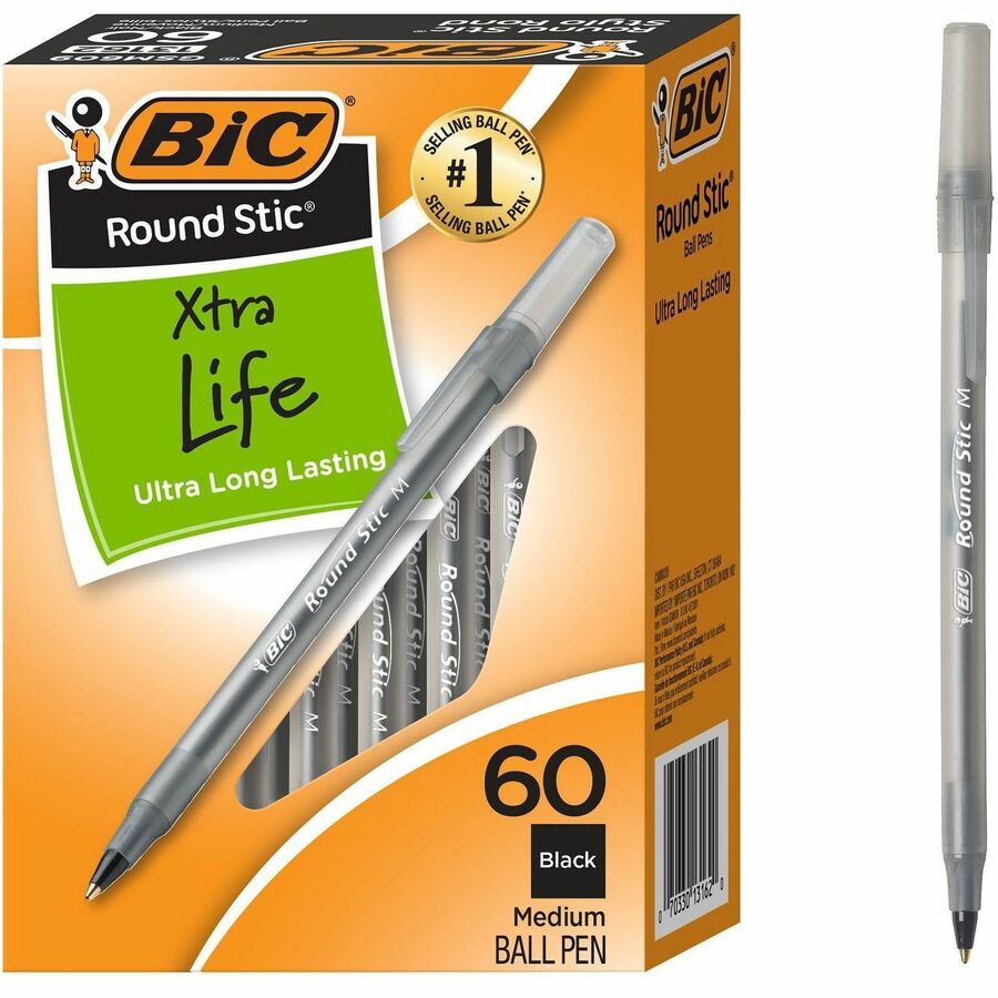 BIC Round Stic Extra Life Black Ballpoint Pens, Medium Point (1.0mm), 60-Count Pack of Bulk Pens, Flexible Round Barrel for Writing Comfort, No. 1 Selling Ballpoint Pens