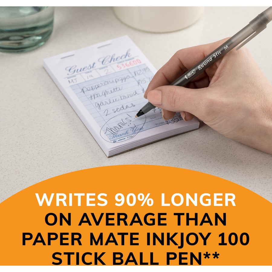 Manufacturer: BICManufacturer Part Number: GSM609-BLKManufacturer Website Address: http://www.bicworld.comBrand Name: BICProduct Line: Round SticProduct Name: Round Stic Ballpoint PenMarketing Information: Combine longevity, consistent performance and smooth writing with BIC Round Stic Extra Life Black Ballpoint Pens. These 1.0mm medium point pens write 90 percent longer compared to PaperMate InkJoy 100 stick ball pens*. Creating clear, dark lines, they're the ideal black pens for writing lists, taking notes and journaling. The flexible round barrel fits snugly in your hand and offers a controlled yet comfortable hold, making it ideal for prolonged writing sessions. Plus, these writing pens provide consistent ink flow, letting you write smoothly and evenly. With this 60-count black ink pens bulk pack, you can stock up on dependable BIC ballpoint pens. Looking for reliable pens for school or office supplies? Choose BIC Round Stic Extra Life Black Ballpoint Pens for a high-quality, affordable product you can trust - write first time, every time. *PaperMate and InkJoy are trademarks of Newell or an affiliate. Newell has not sponsored or approved and is not affiliated with this BIC branded product. Packaged Quantity: 60 PackProduct Type: Ballpoint PenProduct Information