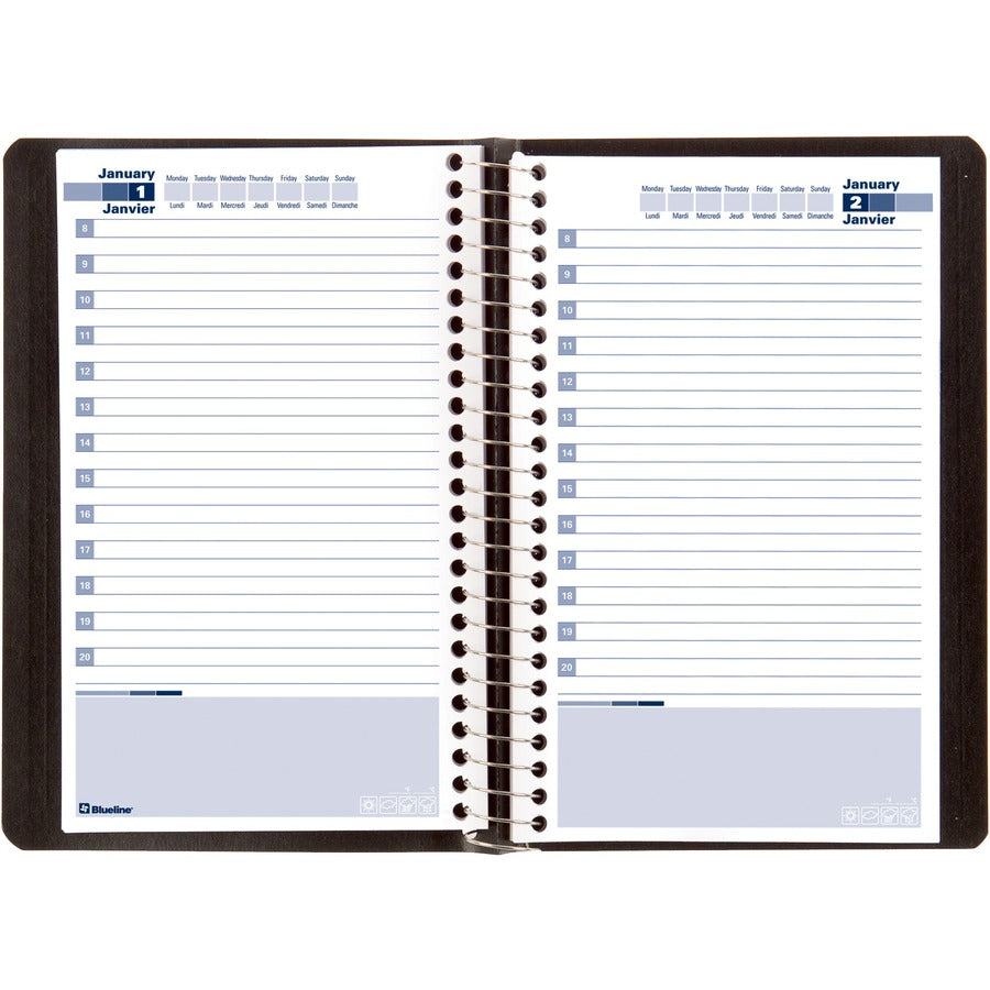 Undated daily planner offers an hourly appointment schedule from 8 AM to 9 PM. Planning pages range 12 months from January to December. Planner features a perpetual calendar, telephone/address/notes section, spiral binding and a soft lizard-like cover. Pages contain post-consumer recycled material. FSC Certified. Bilingual.