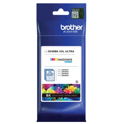 The Brother LC3039BK XXL Black Inkjet Cartridge delivers up to 6,000 pages of sharp, high-quality prints. Designed as an integral part of Brother’s INKvestment Tank system, it ensures optimal performance and superior print quality. This ultra high-yield cartridge is compatible with select Brother all-in-one inkjet printers, including models MFC-J5845DW, MFC-J5845DW XL, MFC-J5945DW, MFC-J6545DW, MFC-J6545DW XL, and MFC-J6945DW, providing reliable, efficient printing for demanding tasks.