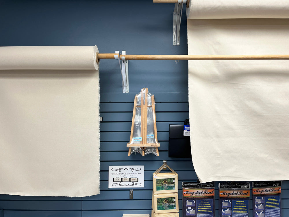 Primed or un-primed 100% cotton duck (10oz.). This professional quality raw canvas is sold by the linear foot off the roll.