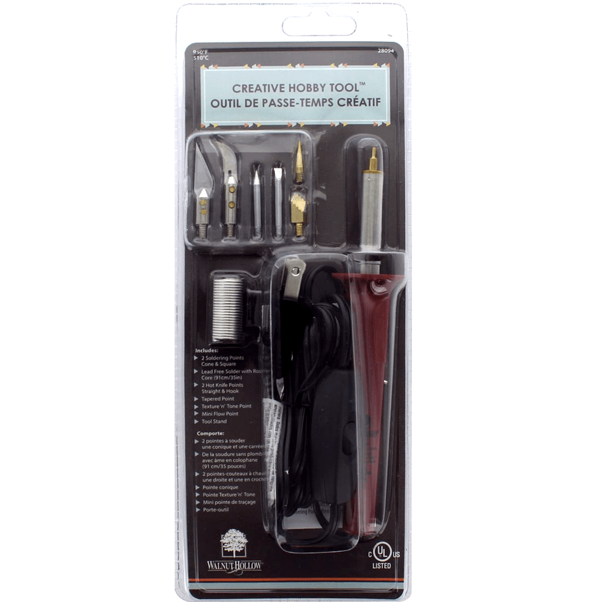 Creative Hobby Tool heats to 950 degrees-F. Includes tapered point, texture 'n' tone point, mini flow point, tool stand, 2 soldering points a cone and a square, 2 hot knife points straight and hook, and 35" of lead free solder with core. Also includes instructions. Use for hot cutting, woodburning, and soldering. All the points are threaded and designed to twist into the end of the tool.