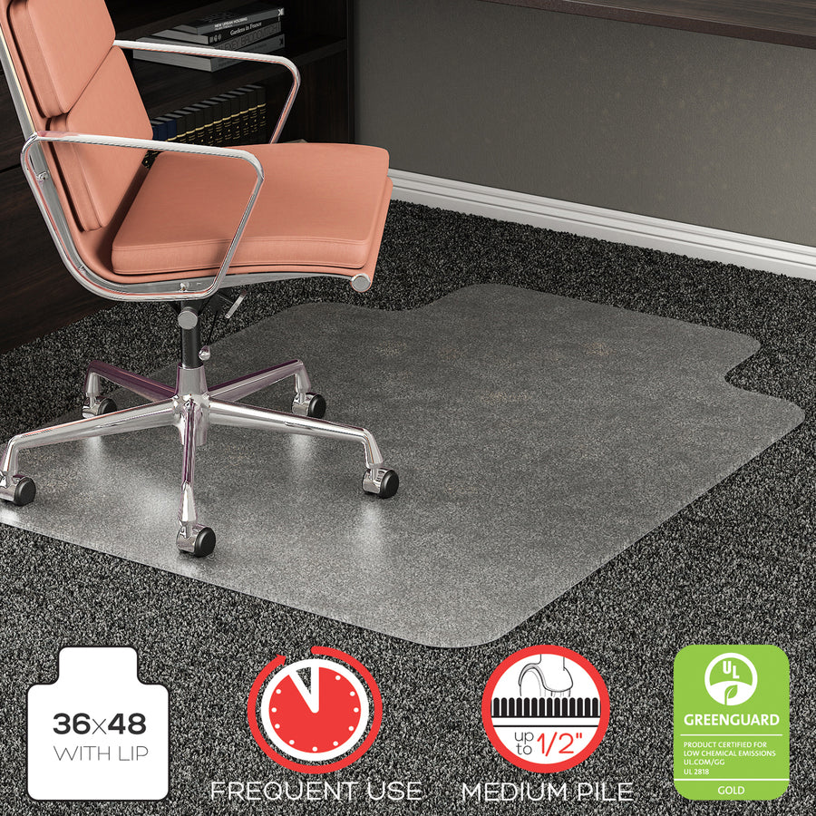 RollaMat Chairmat is ideal for the home office. The heavy vinyl is designed for medium-pile carpets. Smooth, rounded studs won't damage carpet. Textured top surface resists scuffing. Beveled edge allows smooth, on-and-off chair movement. Chairmat features textured top surface and a 19 x 10 lip. Free and Clear formula produces an exceptionally clear mat that is nonphthalate, noncadmium, BPA-free and lead-free.