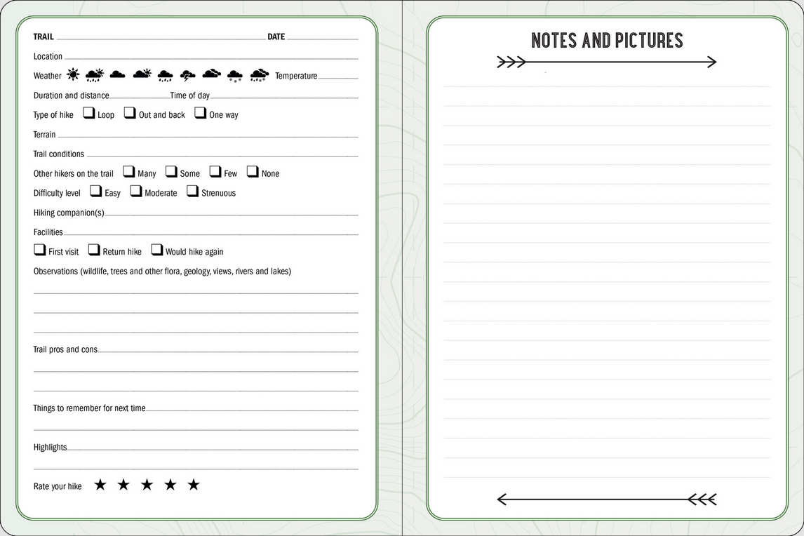 Use this logbook to record the details of your hiking adventures so you can look back on them, share your experiences, and re-visit favourite spots.Use the left-hand page to note the name of the trail, the date, location, weather, temperature, duration, distance, time of day, type of hike, terrain, conditions, difficulty level, companions, facilities, your rating, and more. Tuck trail maps, brochures, and other mementos in the handy pocket inside the back cover. Logbook measures 6-1/4'' wide x 8-1/4'' high with 160 pages.