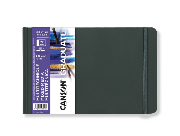 The Canson Graduate books range is designed for artists of any kind who want to express themselves with confidence. These chic books offer many advantages: a hard or a soft cover made from recycled fibers with rounded corners. They have an elegant coloured elastic band closure and an inner gusseted pocket at the end of the book to carefully store memories. These books also feature a practical ribbon bookmark with a binding system that allows the booklet to be opened flat. Each book has 72 pages of 123lb/200gsm lightly textured mixed media paper.
