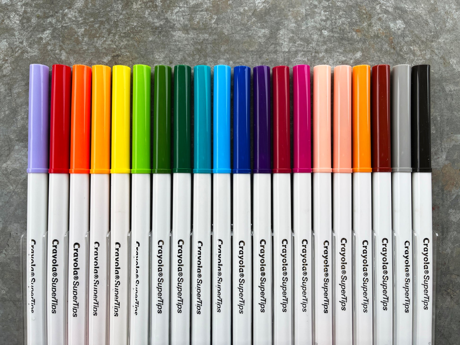 Crayola Super Tips markers have unique durable tips that are smooth and not scratchy. The pointed tip allows to draw thick or thin making them versatile for school, colouring and doodling. Completely washable so your walls and clothes are safe.