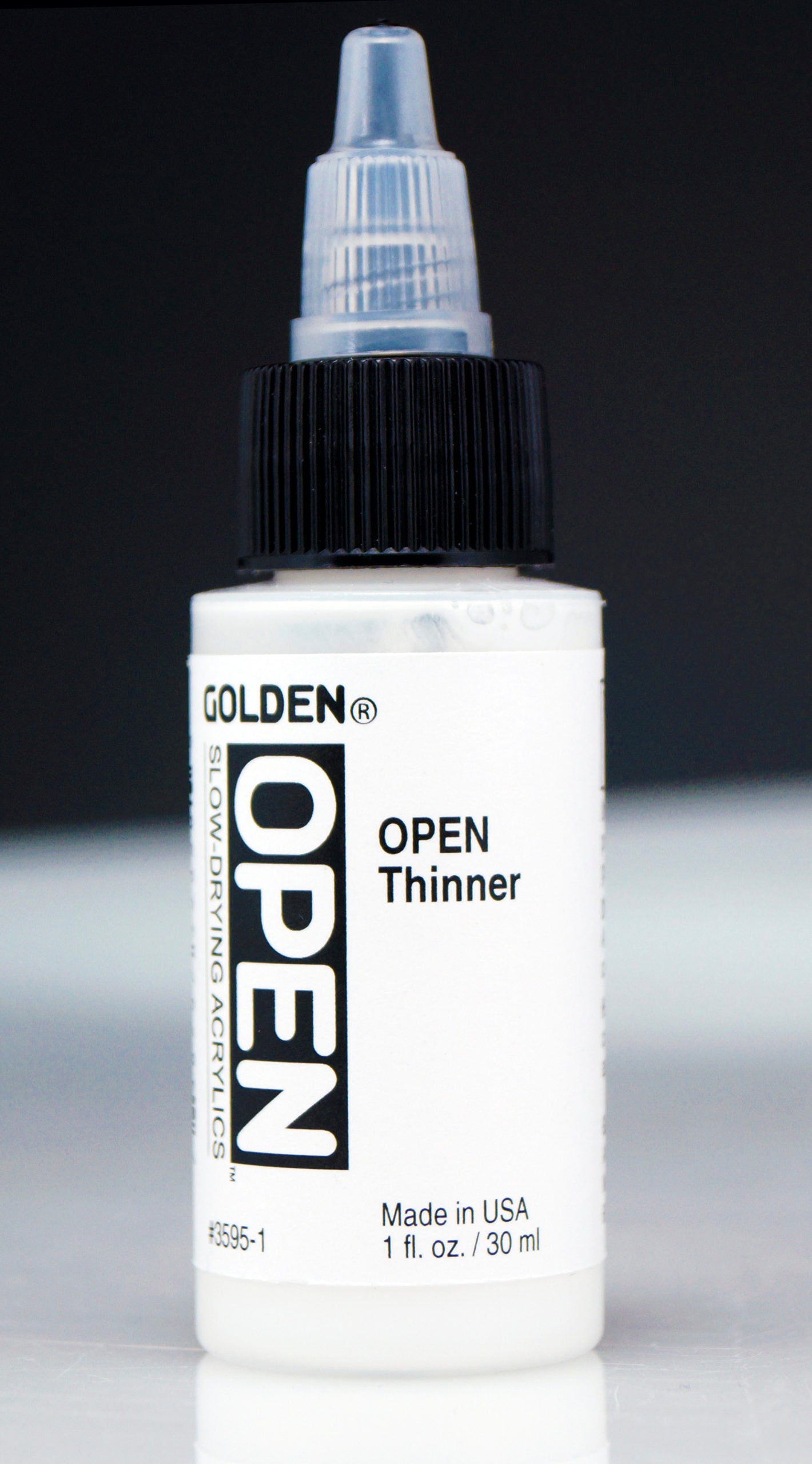 GOLDEN OPEN Thinner is a water-based additive designed to thin the consistency of OPEN Acrylics without altering open time, as well as maintain and adjust the workability of colors on the palette. OPEN Thinner can also function as a thin-bodied retarder when used with GOLDEN Heavy Body or Fluid Acrylics. OPEN Thinner contains no binders, does not form a film, and should never be used alone.