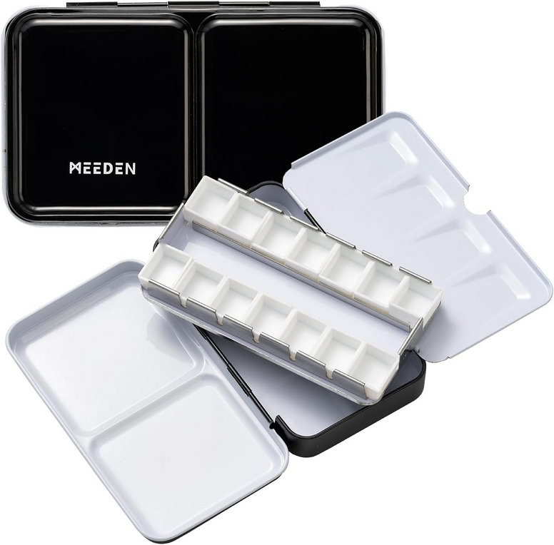 This small tin box transforms into a compact, easy-to-carry unit with a foldable palette perfect for travel. Its sturdy, rust-resistant design ensures durability. Features a white enamel lid and a fold-out tray that serve as a mixing palette, with rolled edges for safety and a thumb ring for stability while painting. Includes 14 removable half pans, each with a 2 ml capacity, making it easy to switch colours and clean.