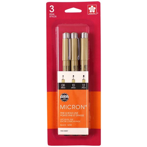 When accuracy, minute details, and preservation count, the unparalleled archival quality of Pigma Micron pens makes them everyone's first choice. The first disposable technical pen using archival pigmented ink, Pigma Micron ink pen is selected for fine-point technical and artistic applications requiring top quality capabilities. Ink is archival, quick drying, fade resistant, & waterproof. Set contains one each of: 08(.50mm), 10(.60mm), & 12(.70mm)