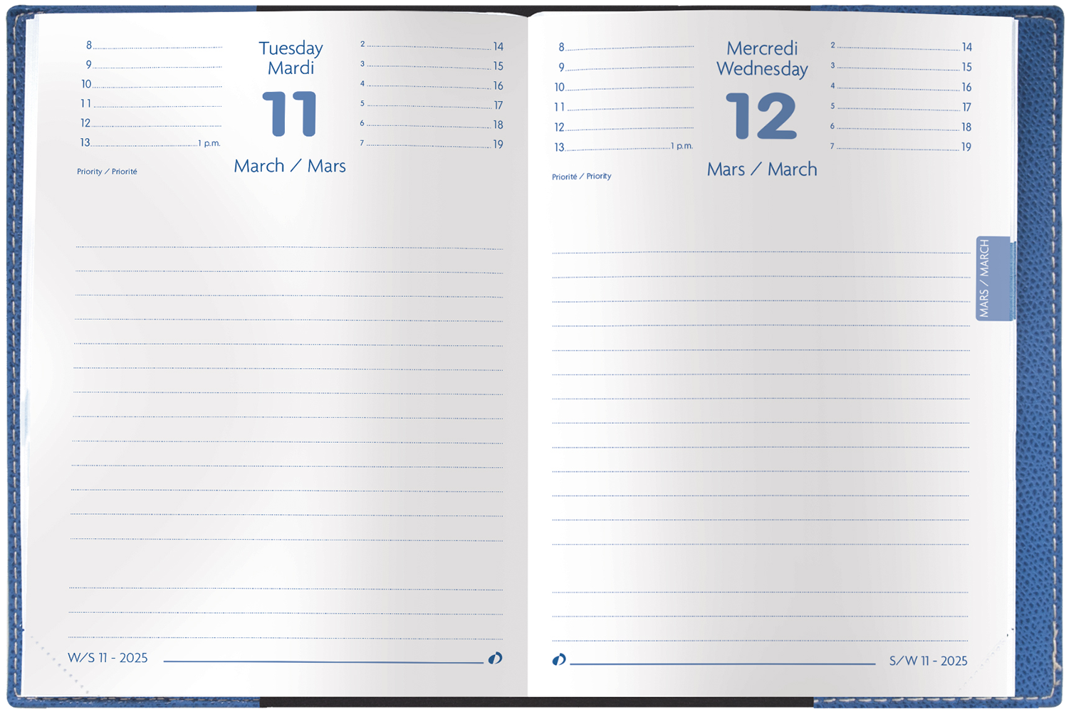 The planner includes a tear-off corner to mark the current day, monthly tabs for quick navigation, and a sewn binding that ensures strength and flexibility. It also contains a bound-in bilingual Address/Memo book insert and is refillable.