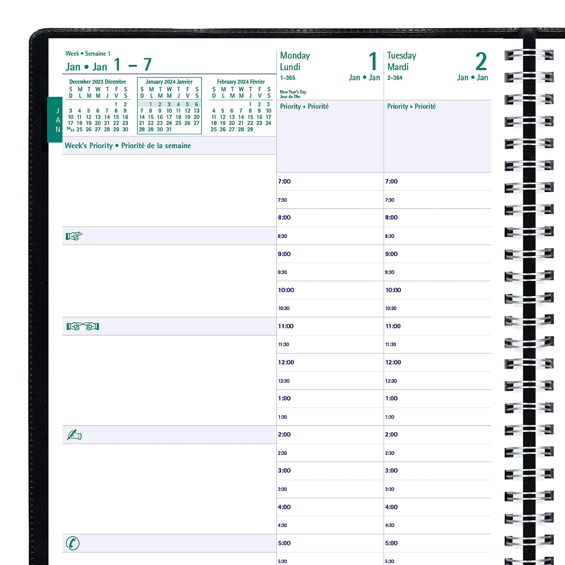 It features twin-wire binding and a soft Castillan vinyl black cover for durability. Each seven-day spread includes sections for daily priorities, phone calls, correspondence, and personal notes, along with monthly planners ahead of each month. Additional tools include a countdown of days passed and upcoming, holiday and moon phase highlights, and a telephone and address booklet.