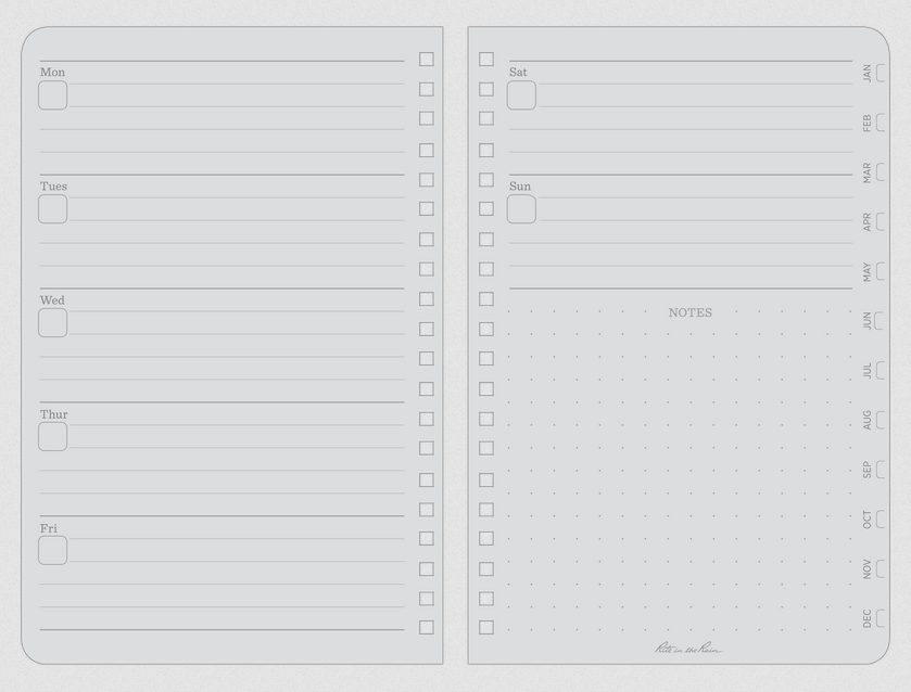 This tough little planner can go anywhere you can with Rite in the Rain's waterproof paper and the durable poly cover. Inside you'll fine a blank weekly style layout for all your scheduling or recording needs so you can start and stop at anytime during the year. Has 108 pages and measures 4.75" x 7.25" so it easily fits in a bag for travel.