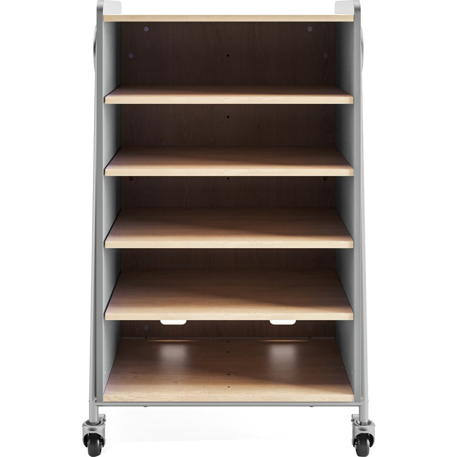 Get multi-functional storage that will last with the Whiffle double-column 48 H rolling storage cart. Four shelves that span across two columns give you have plenty of space to store all your supplies. The multi-functional mobile design features a laminate work surface and a magnetic, dry-erase laminate back, so you can use it to house a laptop or display ideas. Once youre done, simply roll it out of way on the units heavy-duty swiveling casters, which lock into place for safety. Choose from three vibrant color panel options to brighten your media center, administrative area, or classroom.