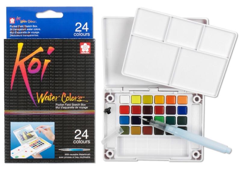 These sets feature artist quality Koi watercolors, specially formulated to blend easily to create an endless color range. Each set includes a large water reservoir barrel, a detachable medium brush tip, two dabbing sponges, a snap lid that acts as an easel for postcard size papers, a detachable, pegged palette that secures to the set base either to the right, left or center sides and a base pull-down ring that allows for easy gripping. The sets measure 6.25"w x 4.5"h x 1.125"d.