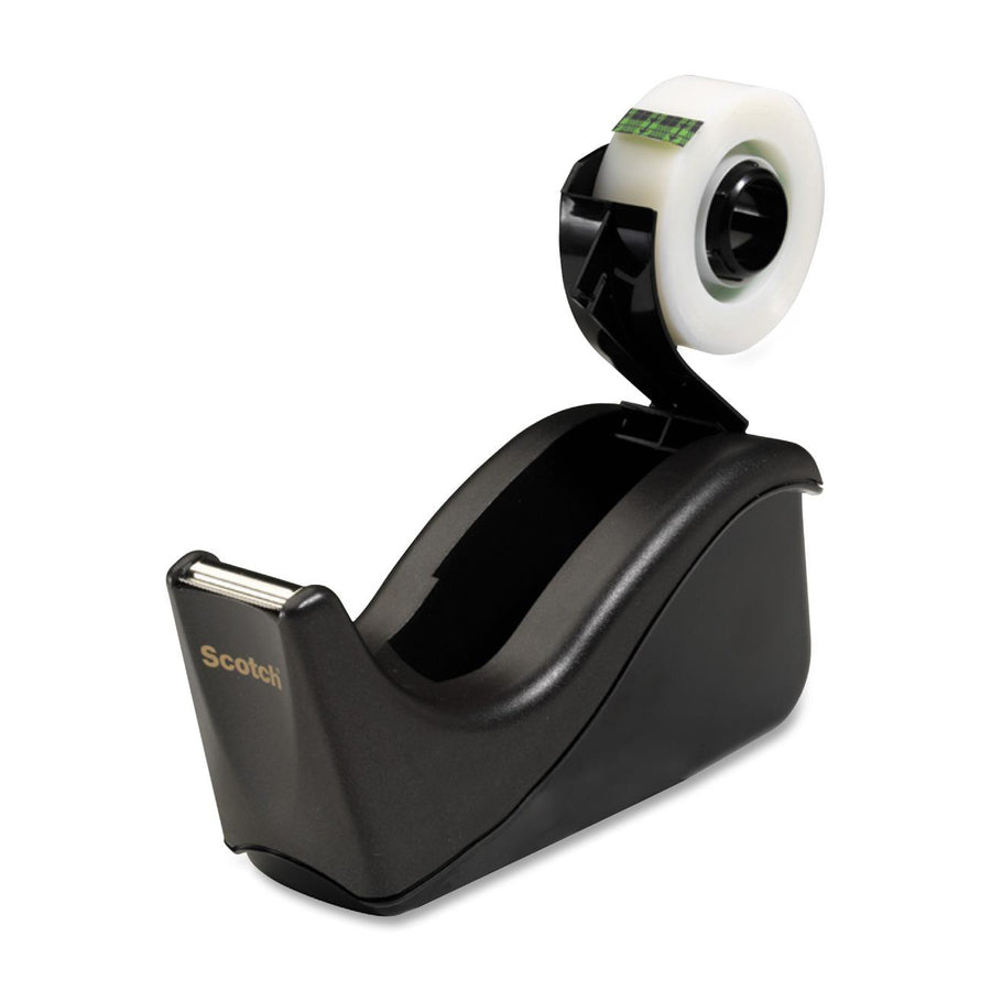 Marketing Information: Desktop tape dispenser features a sleek, wave design. Attached tape hub cannot get lost. Heavily weighted nonskid base allows easy, one-handed dispensing. Dispenser holds 1/2 or 3/4 wide tape on a 1 core up to 1500 long.