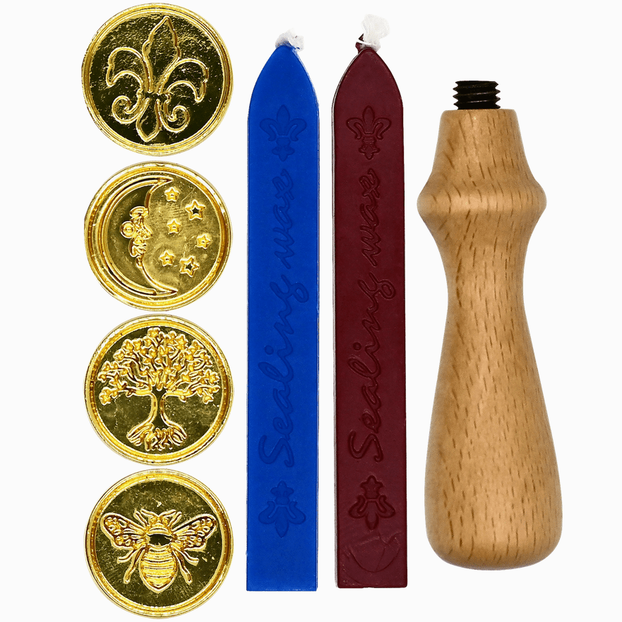 Seal images depict a fleur-de-lis, a crescent moon and stars, a bumblebee, and a tree of life. Seal stamps attach easily to the wooden handle.