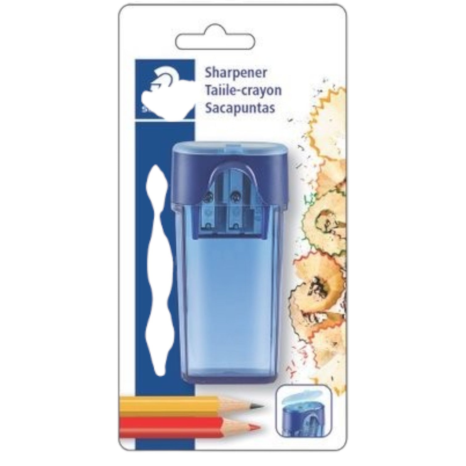 The Staedtler Sharpener Double-hole Tall Sharpener is designed for precision and versatility. It features two holes tailored for standard blacklead pencils up to 8.2 mm diameter with a 23° sharpening angle, perfect for clear, accurate lines, and thicker blacklead or colored pencils up to 10.2 mm diameter with a 30° angle for broader, softer strokes. Its oblong container with a hinged, safety-locked flip-top keeps shavings secure and prevents spills, ensuring a clean and efficient sharpening experience every time.