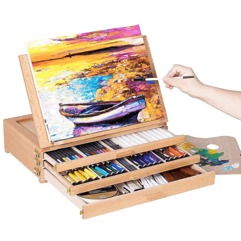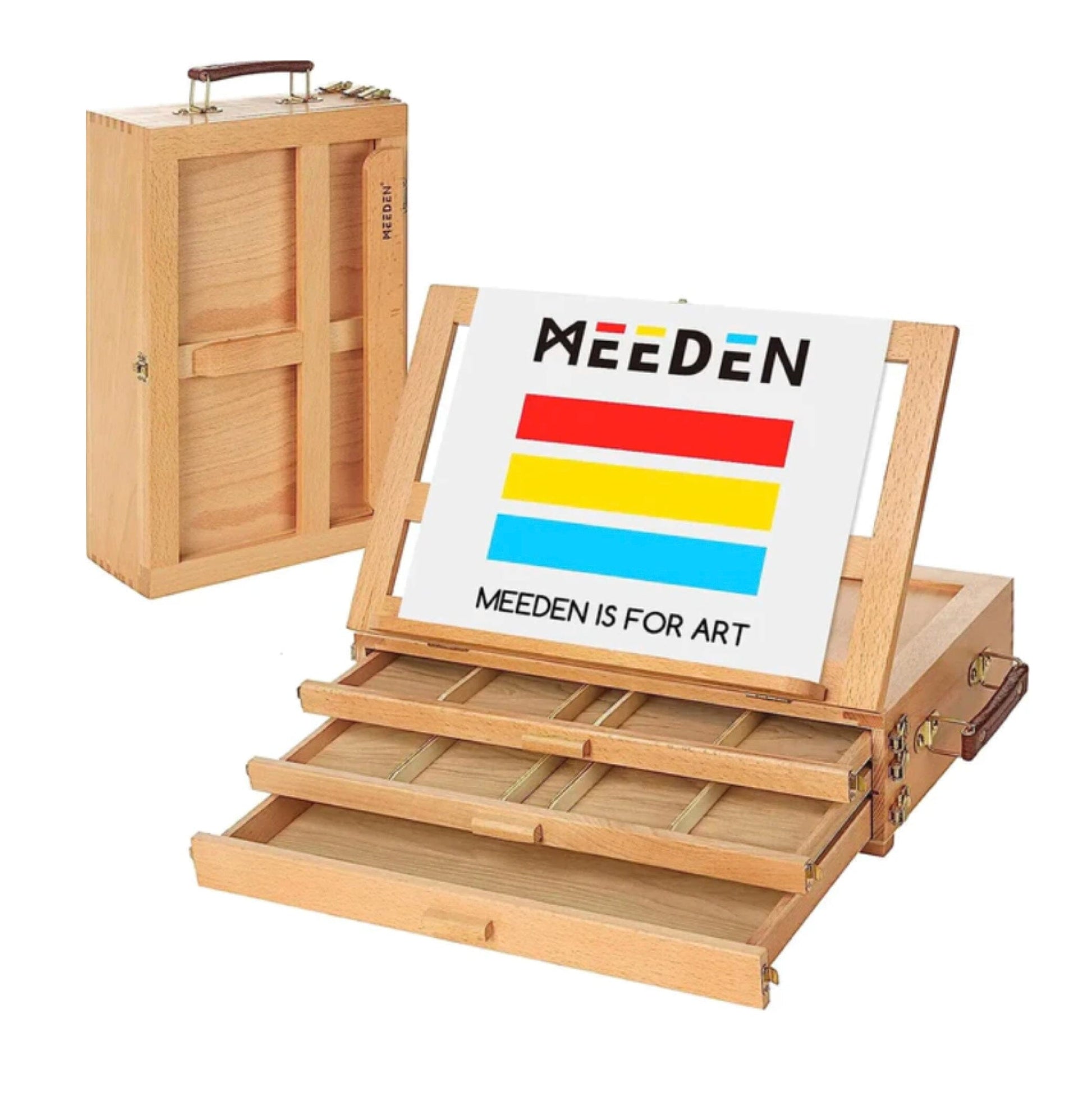 The top easel portion has 4 recline positions. Each individual drawer features 2 latches to keep them closed when carrying. The wood drawers have slots suited for for pencils, pens, brushes and assorted tools and supplies.