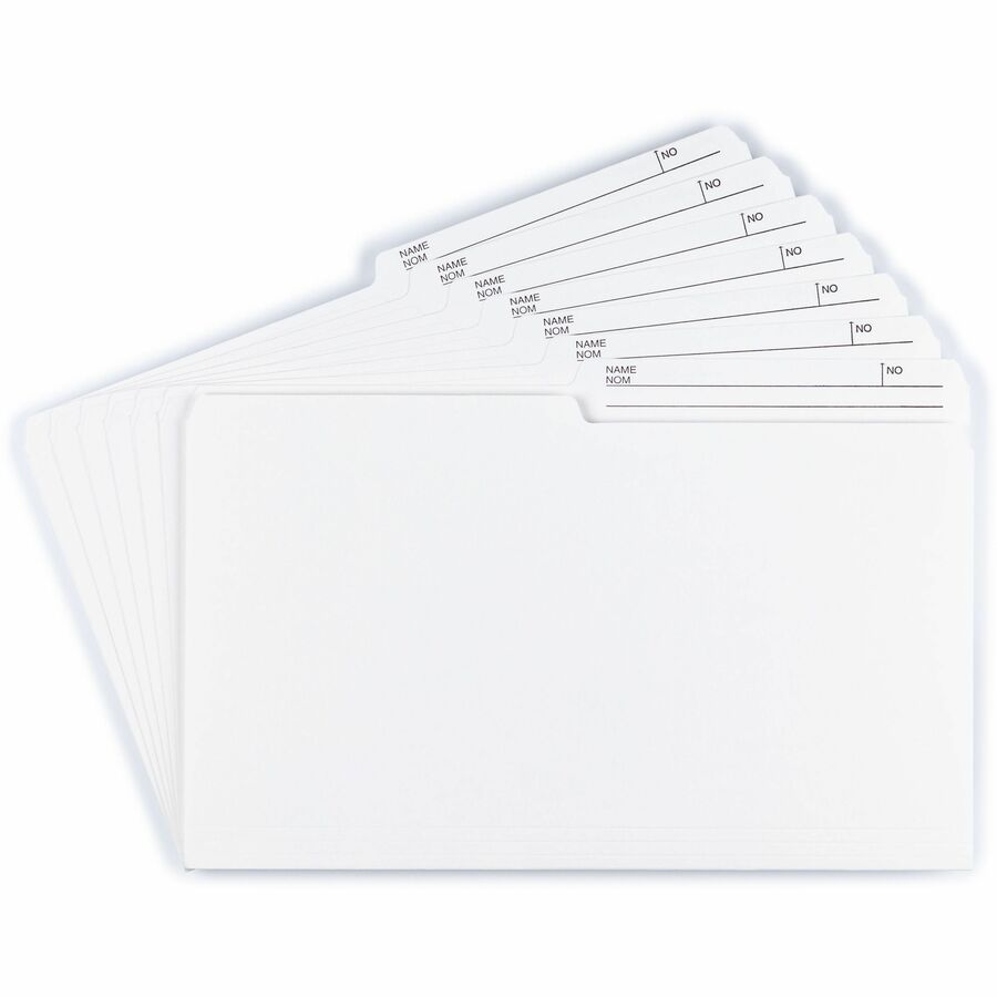 Single ply tab reversible file folders include wide 1/2-cut, single-ply tabs printed on both sides with name/nom: no. This makes it possible to use them in straight line filing systems with tab in either first or second position. Just fold front panels around to create opposite tab position. Front panels are undercut and top corners are rounded front and back. Single ply tab reversible file folders are scored for 3/4 expansion.