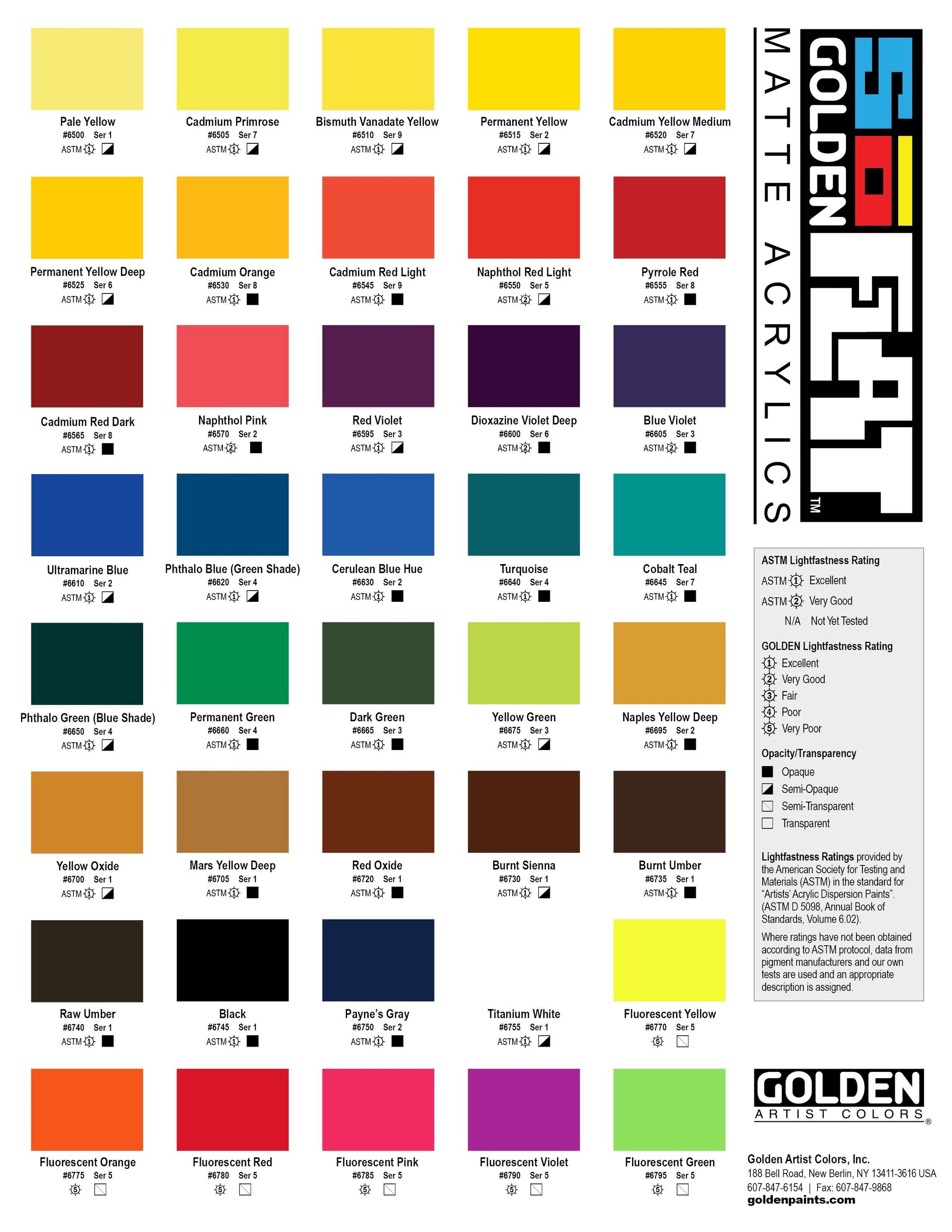 €¢ Distinct palette of 40 colors, available in 2, 4 and 16 oz. jars €¢ Smooth, viscous fluid consistency €¢ Colours are opaque in one or two coats €¢ 100% acrylic and compatible with other GOLDEN paints and mediums