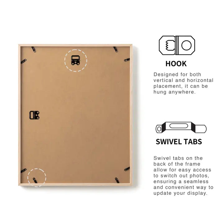 Includes white mat for an 11x14" image. The frame design features a sturdy back panel with a built-in hooks for both horizontal or vertical placement